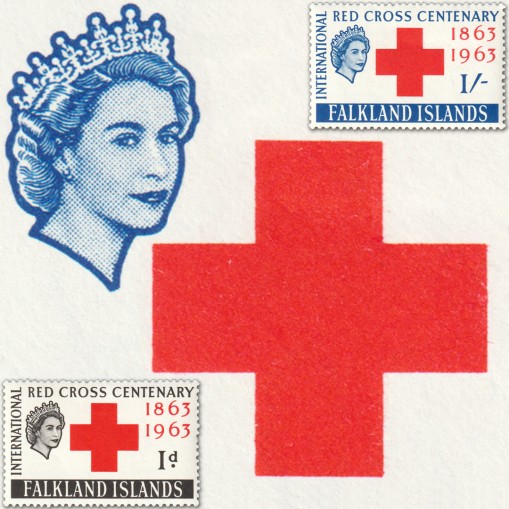 Znaczki upamiętniające stulecie Czerwonego Krzyża. Na znaczkach widnieje symbol czerwonego krzyża i portret Elżbiety II.
