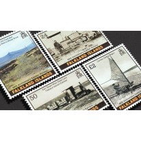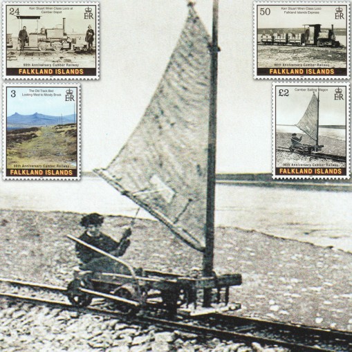 Znaczki upamiętniające 90. rocznicę budowy linii kolejowej Camber na Falklandach.