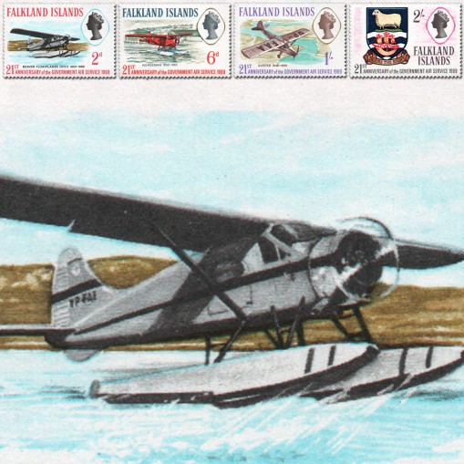 Znaczki upamiętniające 21-lecie istnienia samolotów rządowych na Falklandach.