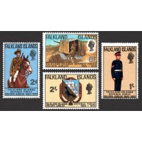 Na znaczkach widnieją kolejno: ochotnik na koniu, stanowisko obronne, oficer w mundurze i dawny herb Falklandów.