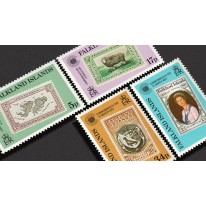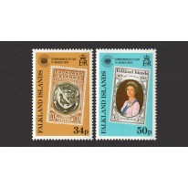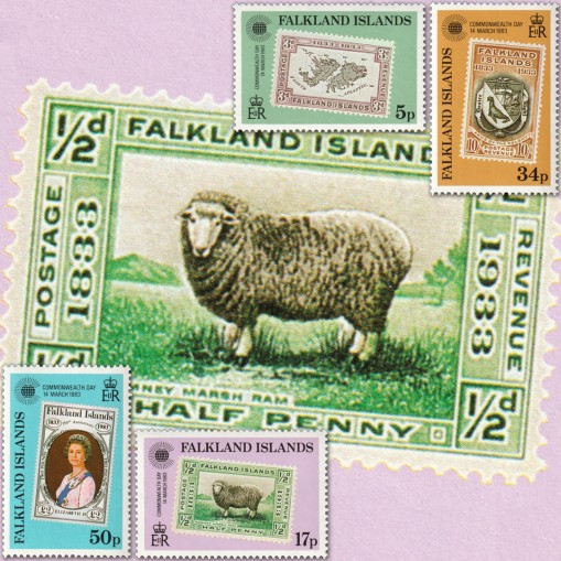 Na ostatnim znaczku widnieje znaczek upamiętniający 150-lecie brytyjskiej administracji Falklandów z tego samego roku, z portretem królowej Elżbiety II.