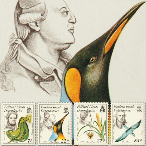 Na znaczkach widnieją portrety przyrodników z XVIII i XIX wieku w towarzystwie badanych przez nich gatunków fauny i flory z wysp Południowego Atlantyku, kolejno: