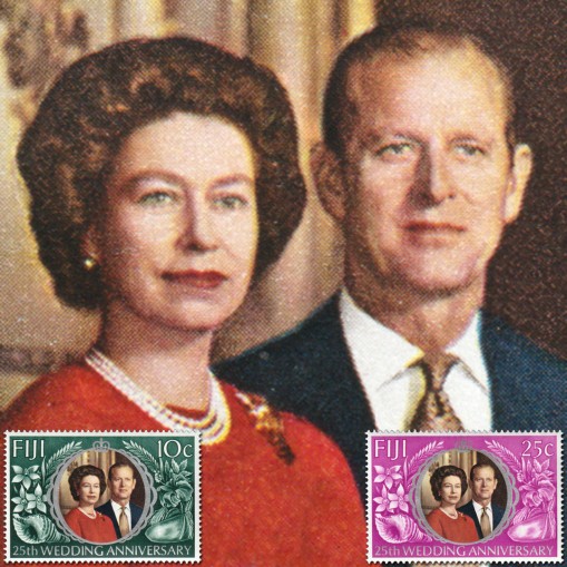 Znaczki upamiętniające 25. rocznicę ślubu królowej Elżbiety II i księcia Filipa.