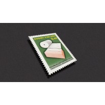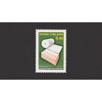 Znaczek promujący finlandzki przemysł drzewny, przedstawiający belę celulozową oraz rolkę papieru, z wygrawerowaną pośrodku choinką.