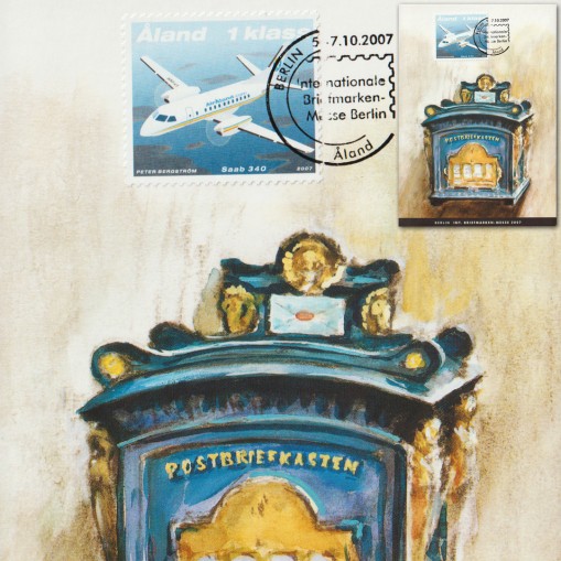Znaczek na karcie maksimum, na którym widnieje samolot transportujący pocztę (model Saab 340).