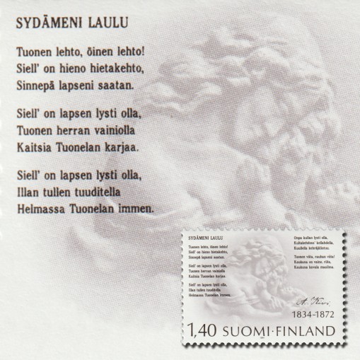 Aleksis Kivi (właściwie: Alexis Stenvall, 1834-1872) był fińskim prozaikiem, poetą i dramaturgiem. Napisał pierwszą powieść w języku fińskim zatytułowaną „Siedmiu braci” (1870). Z tej powieści pochodzi wiersz zacytowany na znaczku - „Sydämeni laulu” („Pieśń mojego serca”).