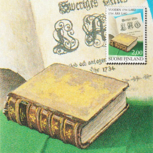 Znaczek wydany z okazji 250. rocznicy Kodeksu Cywilnego obowiązującego w Finlandii.