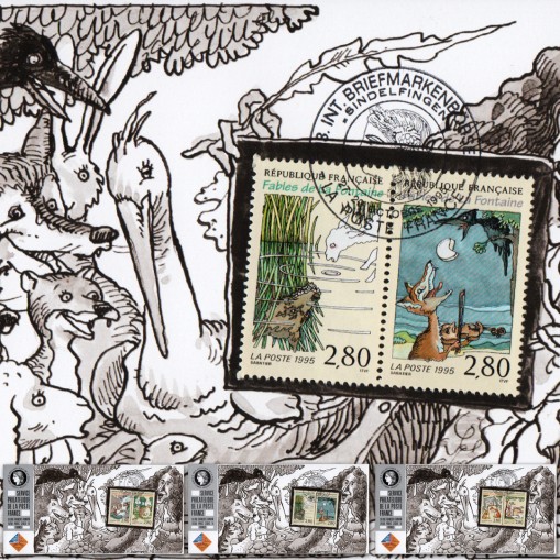 Znaczki upamiętniają 300. rocznicę śmierci francuskiego pisarza Jeana de La Fontaine'a, autora blisko 250 bajek. Na znaczkach widnieją ilustracje jego bajek, m.in. "Zając i żółw" czy "Wilk i owca".