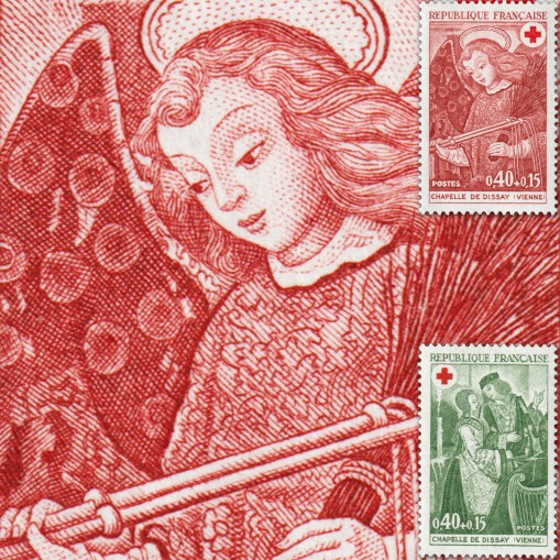 Na znaczkach przedstawiono dwa piękne freski z kaplicy na zamku Dissay (Château de Dissay).