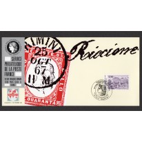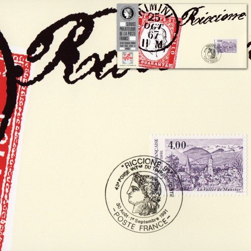 Znaczek na okolicznościowej karcie maksimum promującej pocztę francuską na międzynarodowych targach filatelistycznych Riccione'91.