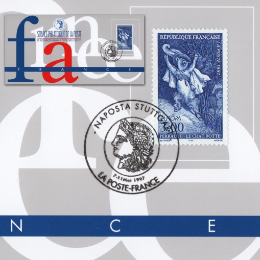 Znaczek na okolicznościowej karcie maksimum promującej pocztę francuską na międzynarodowej wystawie filatelistycznej Naposta w Stuttgarcie.