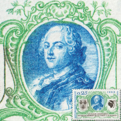 Na znaczku widnieje portret króla Ludwika XV oraz herby Korsyki i Francji.