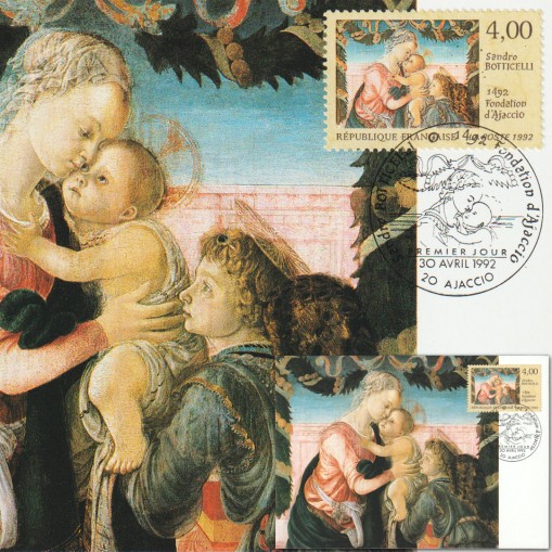 Na znaczku widnieje reprodukcja dzieła autorstwa renesansowego malarza Sandro Botticelli'ego pod tytułem "Madonna z Dzieciątkiem i aniołem pod girlandą".