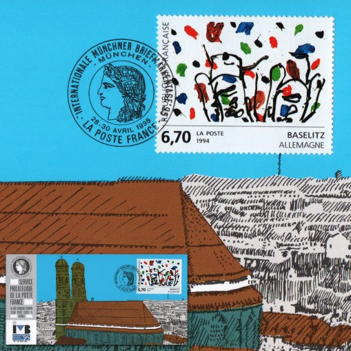Znaczek na okolicznościowej karcie maksimum promującej pocztę francuską na międzynarodowej wystawie filatelistycznej w Monachium.