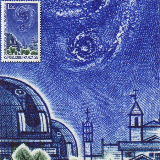 Znaczek promujący francuskie narodowe obserwatorium astronomiczne założone w 1937 roku, znane jako Observatoire de Haute-Provence (OHP, obserwatorium Haute-Provence).