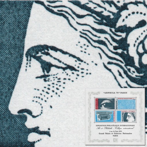 Na znaczkach widnieje oko, zwieńczenie kolumny, napis „ARPHILA 75 PARIS” i głowa bogini Ceres (fragment znaczka z 1849 roku).