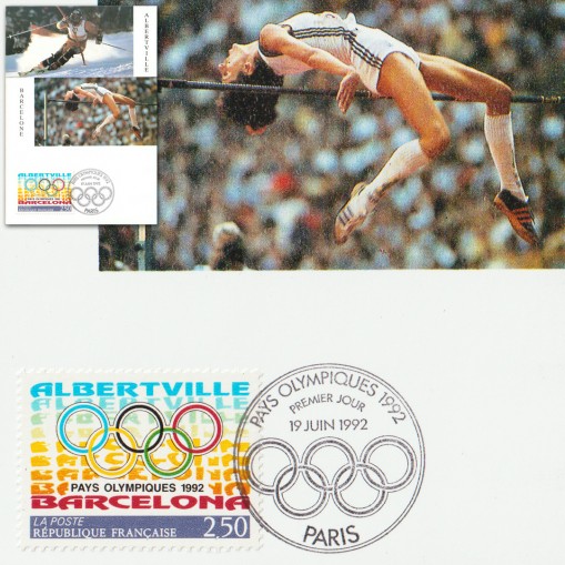 Znaczek na karcie maksimum upamiętniający letnie igrzyska olimpijskie w Barcelonie i zimowe igrzyska olimpijskie w Albertville.