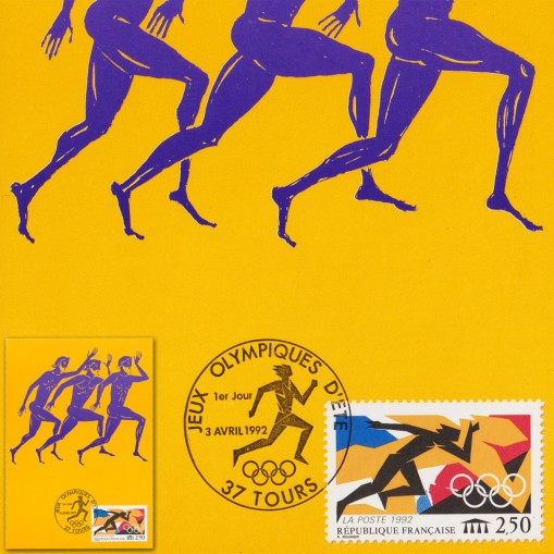 Na znaczku widnieje biegacz i pierścienie olimpijskie, na karcie zaś przedstawiono biegaczy stylizowanych na malowidła ze starożytnej Grecji.
