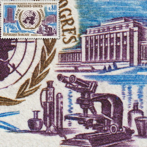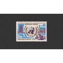 Na znaczku widnieje logo organizacji oraz jej siedziby w Nowym Jorku i Genewie.
