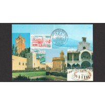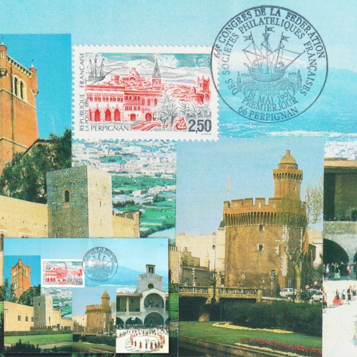 Na znaczku i karcie widnieje miasto Perpignan w południowej Francji i niektóre z jego zabytków: pałac królów Majorki czy Le Castillet.