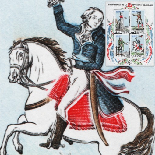 Na znaczkach widnieją słynne osobistości związane z rewolucją francuską, kolejno: