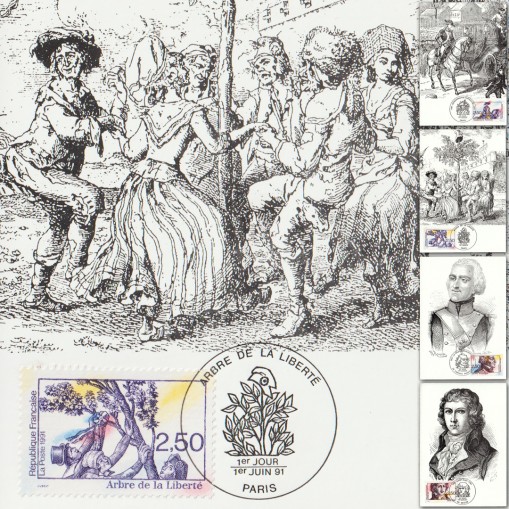 Znaczki na kartach maksimum upamiętniające dwustulecie rewolucji francuskiej.