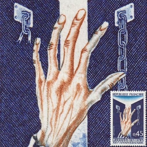 Znaczek upamiętniający 25-lecie wyzwolenia obozów koncentracyjnych.