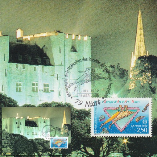 Na znaczku widnieją symbole kultury i znaczek, na karcie zaś przedstawiono zamek w Niort.