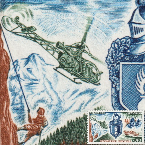 Na znaczku widnieje herb francuskiej Żandarmerii Narodowej i przykłady jej działań (helikopter, jacht motorowy, motocykle, wspinaczka górska).