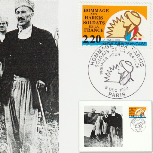 Znaczek na karcie maksimum oddający cześć żołnierzom arabskim z Afryki Północnej walczącym w armii francuskiej (tzw. harkis).