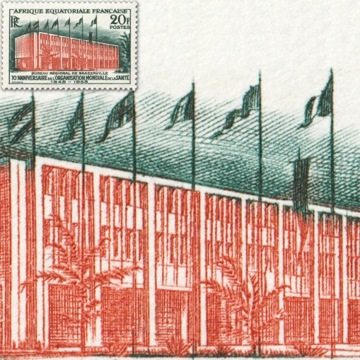Znaczek upamiętniający dziesięciolecie Światowej Organizacji Zdrowia (WHO). Na znaczku przedstawiono budynek regionalnej kwatery WHO w Brazzaville.