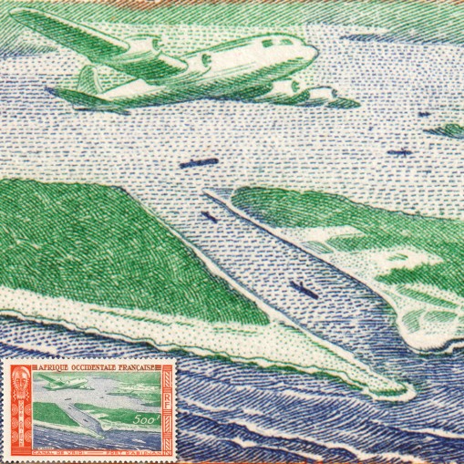 Znaczek widnieje samolot ponad kanałem Vridi i portem w Abidżanie.