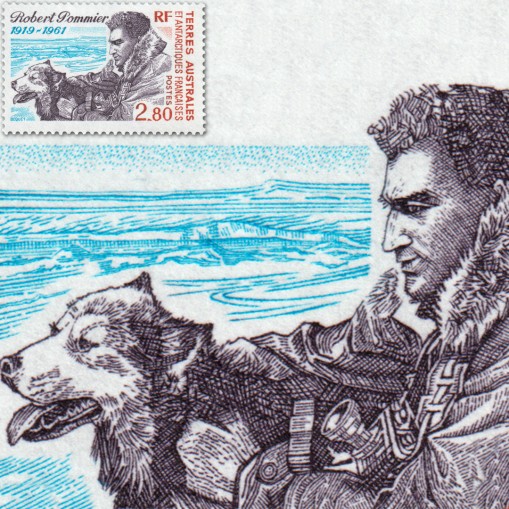 Na znaczku przedstawiono francuskiego badacza Antarktydy, fotografa i pisarza Roberta Pommiera z syberyjskim husky.