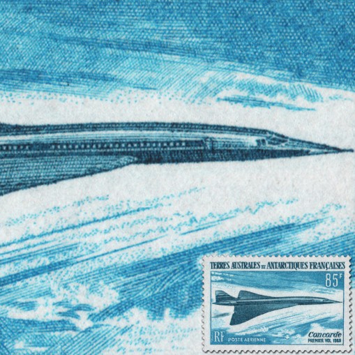 Znaczek upamiętniający pierwszy lot naddźwiękowego samolotu pasażerskiego o napędzie turboodrzutowym „Concorde”.