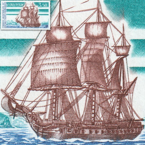 Na znaczku przedstawiono fregatę „Le Gros Ventre".