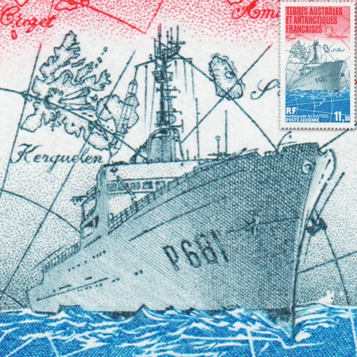Na znaczku przedstawiono kuter patrolowy „Albatros". Walor nagłaśnia zamówienie tej jednostki pływającej przez TAAF.