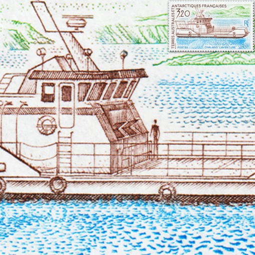 Na znaczku przedstawiono francuską łódź desantową „L'Aventure" („Przygoda"). Podstawowym przeznaczeniem takich łodzi jest transport żołnierzy, uzbrojenia i sprzętu wojskowego oraz wyładunek tych sił w postaci desantu na nieprzygotowanym brzegu. Nazywane są one też barkami desantowymi.
