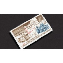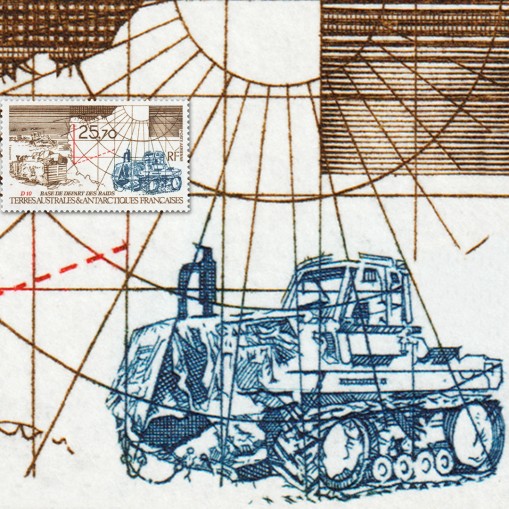 Na znaczku przedstawiono pojazdy śnieżne przy bazie polarnej D 10, przygotowujące się do jednego z wypadów w głąb lądu antarktycznego.