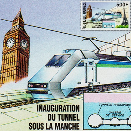 Znaczek wydany z okazji otwarcia Eurotunelu pod kanałem La Manche.