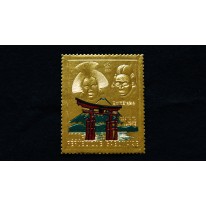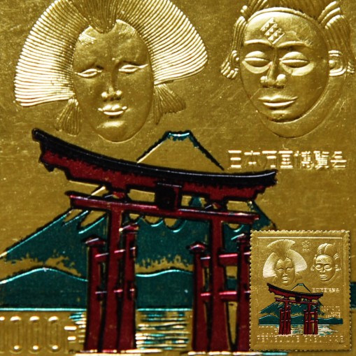 Na znaczku widnieją japońskie maski, brama torii i góra Fudżi.