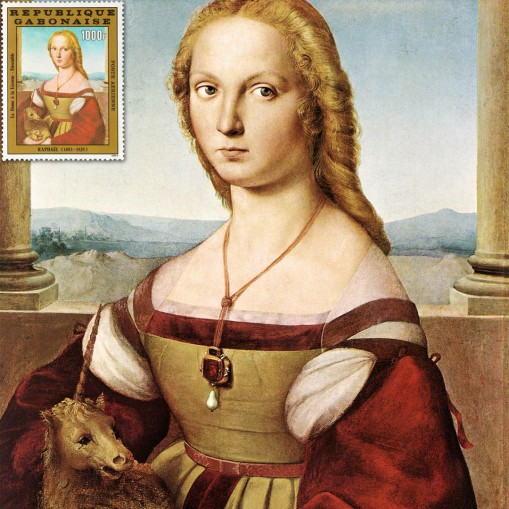 Na znaczku przedstawiono reprodukcję jego dzieła „Dama z jednorożcem". Symbolika dzieła jest niejednoznaczna, bowiem jednorożec mógł symbolizować zarówno czystość dziewiczą, jak i ciążę lub wierność małżeńską.