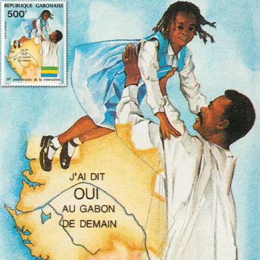 Na znaczku, na tle mapy północno-zachodniej Afryki, przedstawiono symbol odrodzenia, mianowicie ojca bawiącego się z córką. Jest to chyba najbardziej wymowna alegoria zmian w Afryce, gdzie mężczyzna do dzisiaj jest przedstawiany jako głowa domu czy władca rodziny, a nie po prostu jako tata.