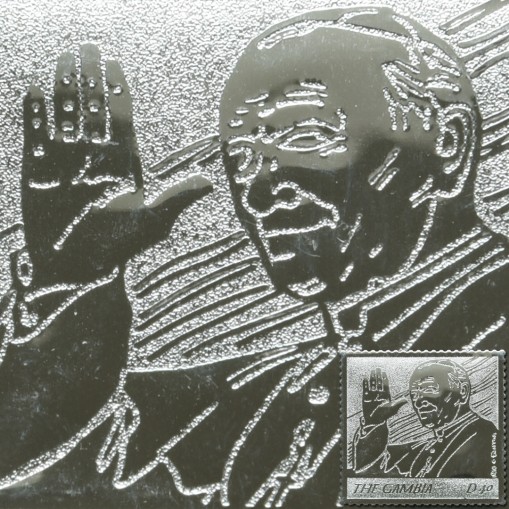 Na znaczku widnieje Ojciec Święty wznoszący rękę w geście pozdrowienia.