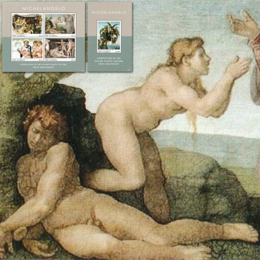 Bloki upamiętniające 500. rocznicę ukończenia prac nad sklepieniem Kaplicy Sykstyńskiej w Rzymie. Na znaczkach widnieją obrazy Michała Anioła: