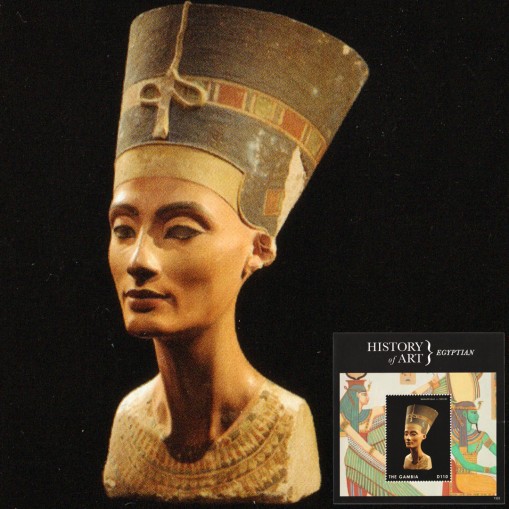 Na znaczku widnieje popiersie egipskiej królowej Nefertiti.