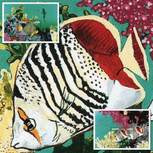 Dwa bloki, na znaczkach których widnieją następujące gatunki ryb: