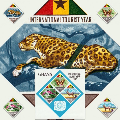 Na każdym walorze widnieje tradycyjny element znaczków ghańskich - flaga Ghany.