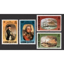 Na znaczkach widnieją portrety Nelsona pędzla J.F. Rigauda i Williama Bechey’a, a także przedstawienia okrętu HMS „Victory”, na którym Nelson walczył w bitwie pod Trafalgarem.