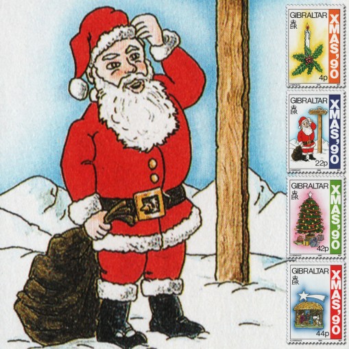 Na znaczkach widnieją kolejno: świeca i gałązka ostrokrzewu, święty Mikołaj, choinka oraz Dzieciątko w żłobku.