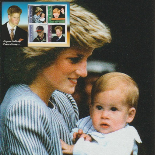 Na znaczkach widnieje książę Harry jako niemowlę z księżną Dianą w 1984 roku oraz, kolejno, jako dziecko, na nartach i w garniturze.